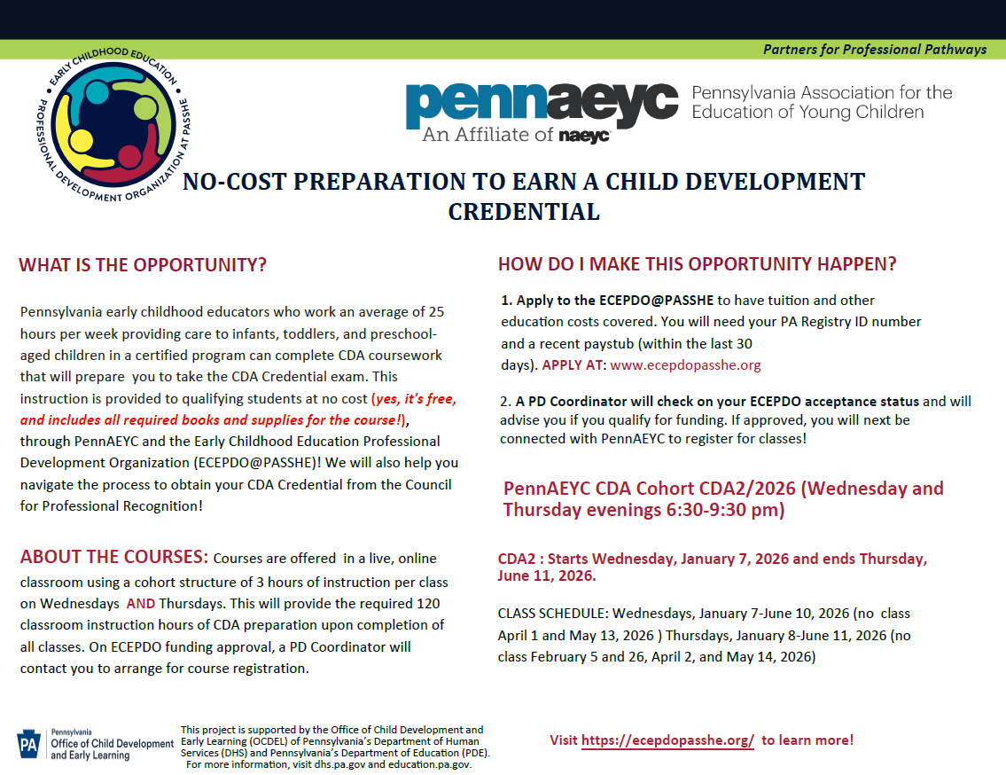 PennAEYC is pleased to partner with the ECE Professional Development at PASSHE to offer CDA Instruction classes in English. Pennsylvania’s early childhood educators within the Central Region who work at least 25 hours/week providing care to infants, toddlers, and pre‐school aged children are eligible for course funding. Students can complete the coursework which will prepare you to take the CDA credential exam. This instruction is provided at no‐cost (yes, it’s free!) if you qualify, through PennAEYC and the Early Childhood Education Professional Development Organization (ECEPDO@PASSHE)! Assistance in navigating the process of obtaining the National CDA Credential will also be provided!